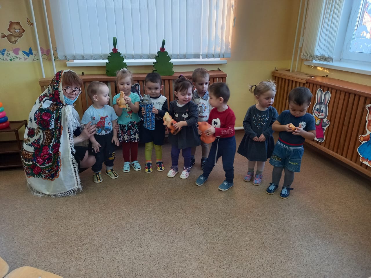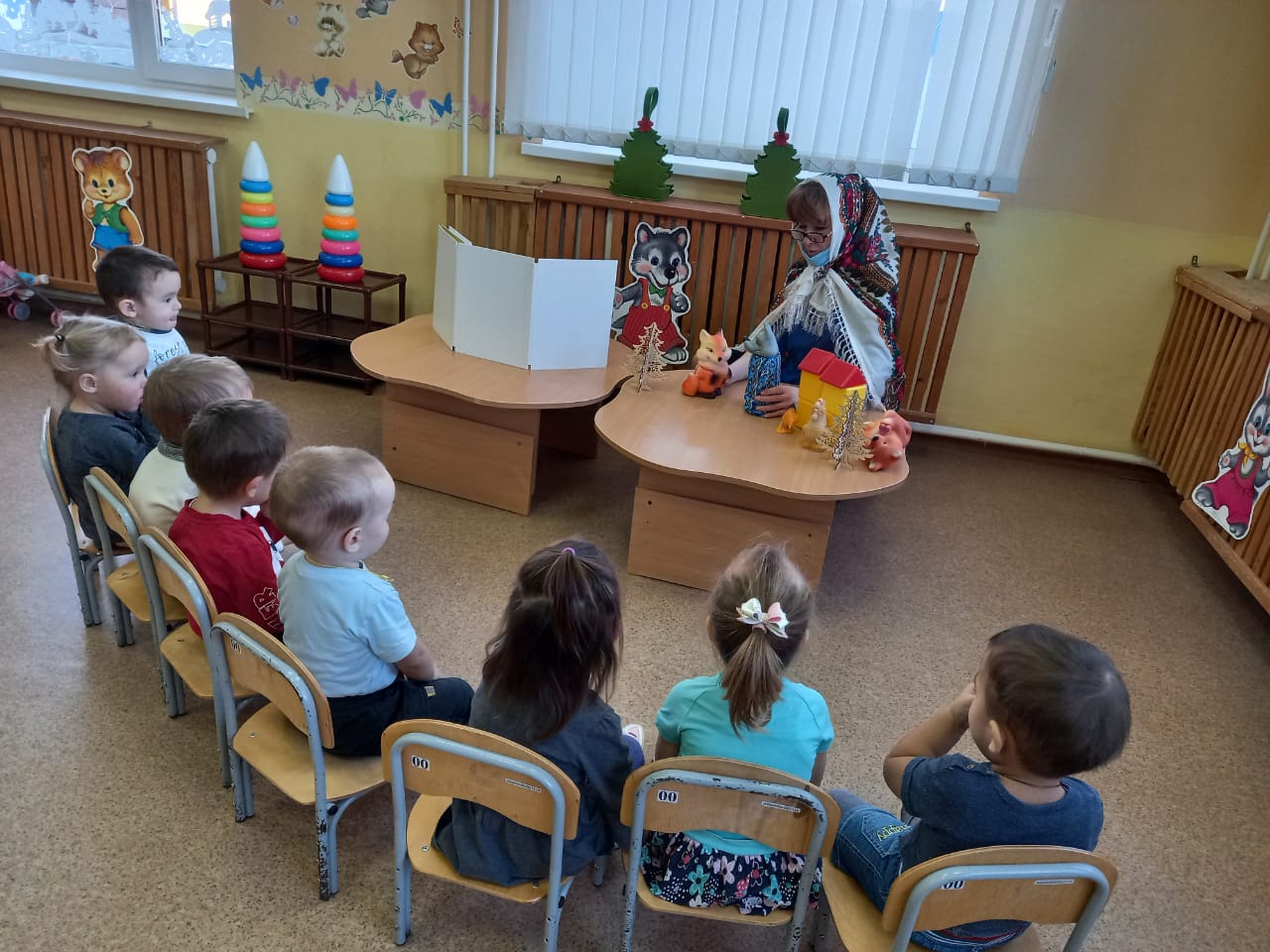 В группе раннего возраста Алчинова С.Н. ознакомила детей с видами театра, играла роль Сказочницы и показала настольный театр «Лиса – строитель».